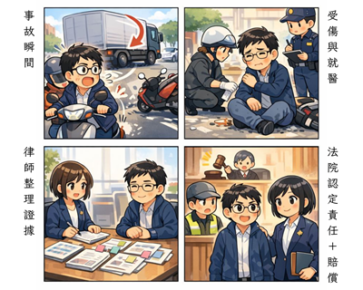 法院在判決書中精闢指出:「身體內部器官、肌肉或骨骼受損,常因肉眼無法即時發現...需待相當時間經過後,始因感到不適就醫而發現。」 法院採信了我們提供的病歷證據,認定林先生後續確診的右肩與臀部傷勢,與車禍具有 相當因果關係,被告辯稱的「退化」不足採信。