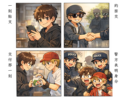 當虛擬約定走向現實面交員警喬裝買家與宋先生取得聯繫,約定以1,500元購買大麻,並以5,500元購買毒品咖啡包。面交當晚,宋先生依約抵達現場,交付了大麻後,正準備讓友人林先生送交咖啡包時,員警當場表明身分 。
