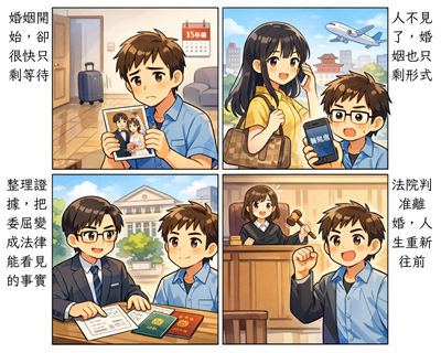 律師建議:面對長期失聯的配偶,不要只訴諸感性,更要整理出「共同生活中斷的客觀時序」。法院要看的是婚姻的「不可回復性」。