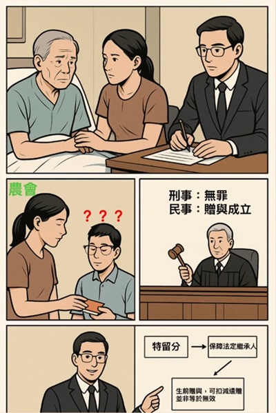 社會大眾很容易覺得:「這就是看護趁機侵吞財產吧?」但法律上要看證據。若朱女只是自己偷偷轉走錢,當然會構成侵占或偽造文書等。但法院查明後,發現游男確實有贈與的意思,還找律師做見證,醫師與農會人員也佐證游男有基本意識,所以認定是「合法贈與」,而不是偷拿。