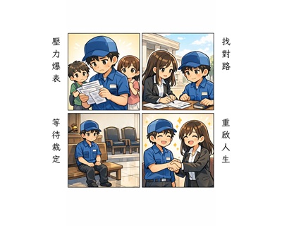 洪先生曾是一名平凡的送貨員。身為基層勞工,他平均月收入僅約23,100元,卻要獨力支撐自己與兩名未成年子女的生活。隨著經濟壓力與債務如滾雪球般壯大,他決定勇敢面對,依《消費者債務清理條例》向法院聲請「更生」。