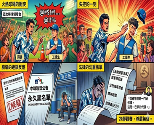 近日,台南亞太國際棒球場舉行中華職棒開幕戰。賽事期間,一名蔣姓男觀眾因不滿現場管制措施,與負責維持秩序的工讀生發生口角,根據現場民眾拍攝之影像及新聞報導,蔣男於爭執中揮手掌摑蔡姓工讀生臉部,導致被害人受有左臉紅腫及口腔黏膜擦傷等傷勢。事發後,蔣男遭所屬之房仲公司發布解聘聲明,中華職棒聯盟亦宣佈將該名觀眾列為永久禁入球場之黑名單。