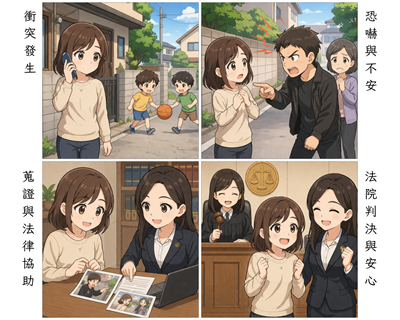 實務建議:遇到類似的鄰里衝突或當街挑釁,請強制啟動防禦機制——「閉嘴、退後、錄音影」。不要試圖用講理去對抗失控的情緒。優先保留現場對話紀錄,確認周遭是否有監視器或第三人,並儘速將時間、地點、人物及對話內容固定下來。你不需要在現場贏得爭執,你需要的是把對方的失控,變成法庭上的呈堂證供 。
