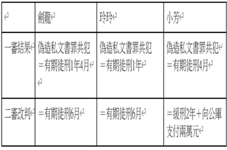 法院於第一審判決,認為前述玲玲與小芳在銀行領錢的行為,同時觸犯行使偽造私文書、詐欺取財及非法由自動付款設備取財3罪,為想像競合犯,應從一重之行使偽造私文書罪處斷。被告劍龍、玲玲與小芳就行使偽造私文書部分,有犯意聯絡及行為分擔,均為共同正犯。