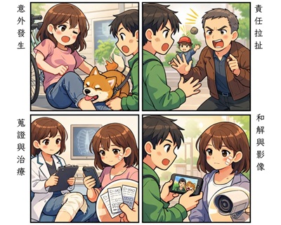 現場蒐證:咬傷位置、血跡、破損物、動物外觀、牽繩/圍籬狀態、警示牌。